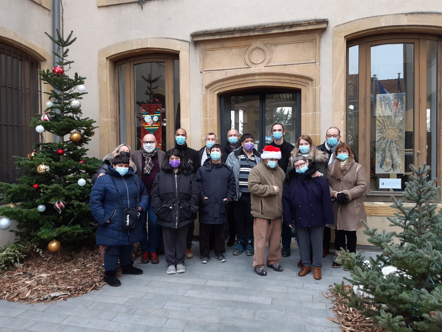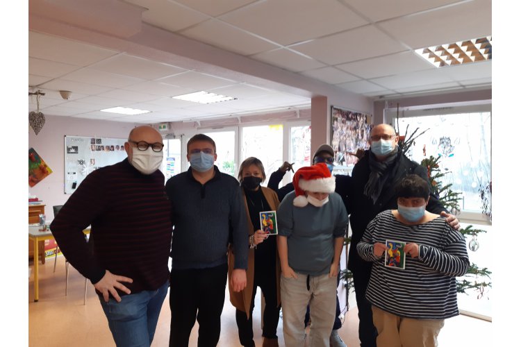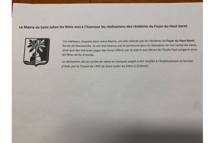 M. Francis FITTANTE, Directeur du Foyer d'Hébergement « Hameau le Haut Soret » à Saint Julien Les Metz, ainsi que l'ensemble de son équipe, souhaite remercier M. Franck OSSWALD, Maire de Saint Julien les Metz, Mme Sandrine HAMM-NIZETTE, 3ème adjointe, ainsi que l'ensemble des élus pour leur participation à l'inclusion des personnes vivant avec un Handicap. Des tableaux réalisés par les résidents du foyer sont actuellement exposés en Mairie de Saint Julien Les Metz jusqu'à fin Janvier 2022. Ils ont également été retenus par la commune pour la réalisation de cartes de voeux, ainsi que des marques pages qui seront offerts avec des livres par la mairie aux élèves de l'école Paul Langevin à l'occasion des fêtes de fin d'année.