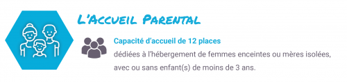 L'Accueil Parental permet, au sein même du CHRS, l'hébergement et l'accompagnement de femmes enceintes ou mères isolées, avec ou sans enfant(s) de moins de 3 ans. Il est également possible d'accompagner, et ce uniquement en appartements diffus, des hommes seuls ou des couples avec enfants. On se situe là dans le champ particulier de la protection de l'enfance et des compétences du Conseil Départemental.