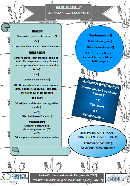 Nous sommes heureux de vous présenter le menu du Rest'art du 18 mai au 21 mai 2021.