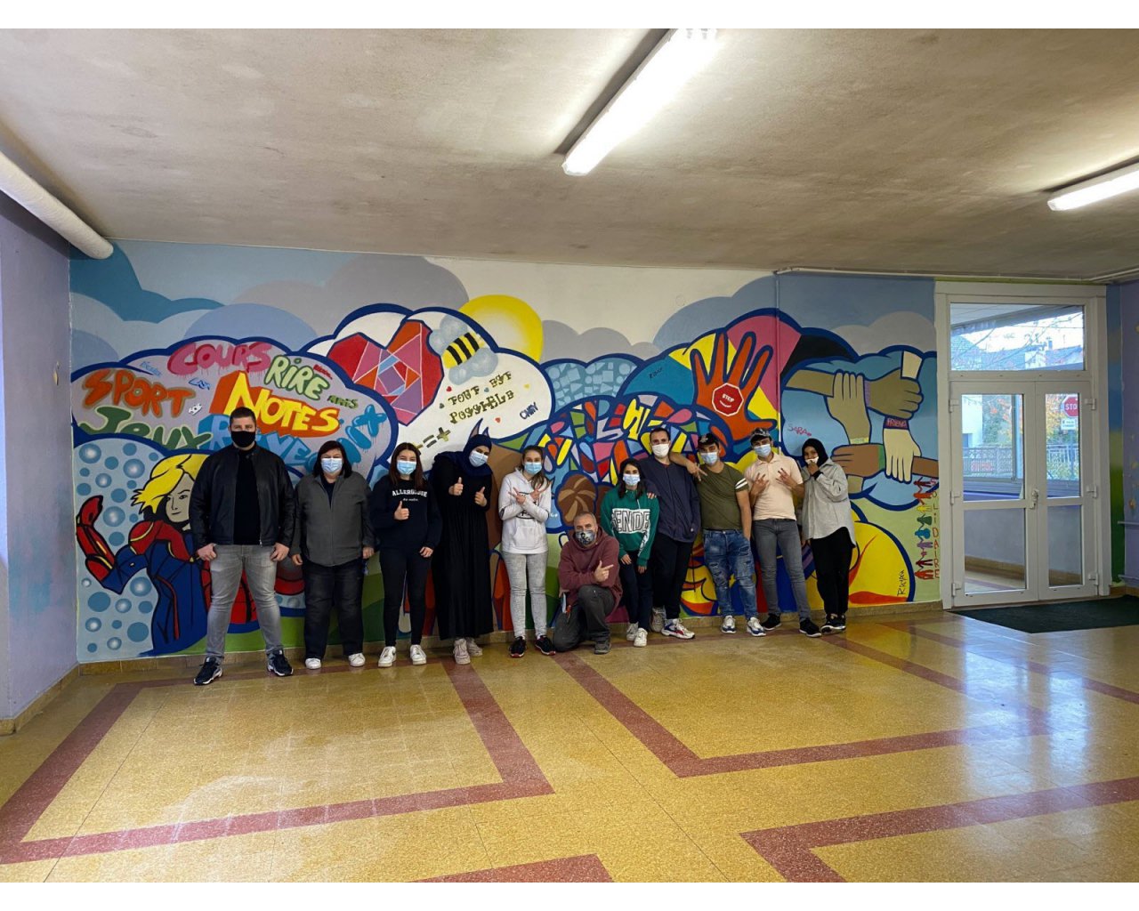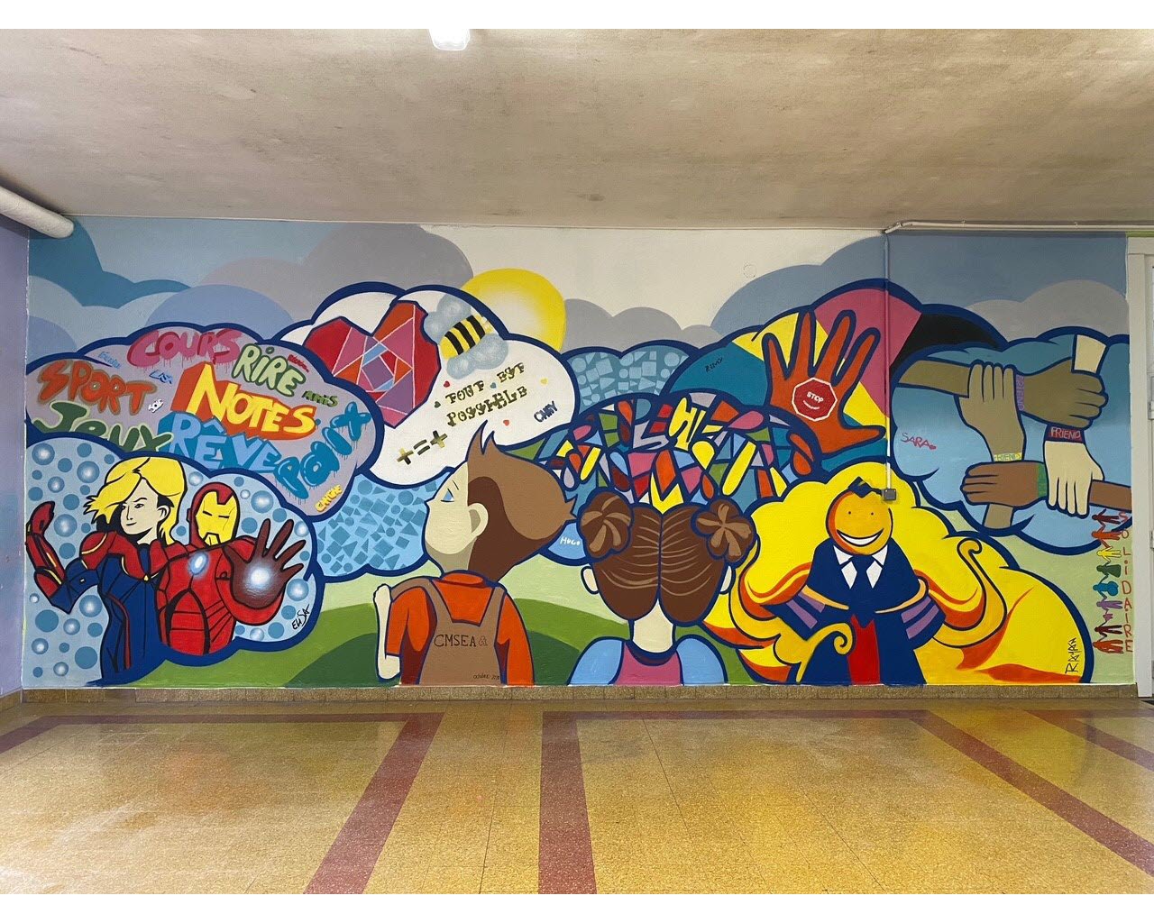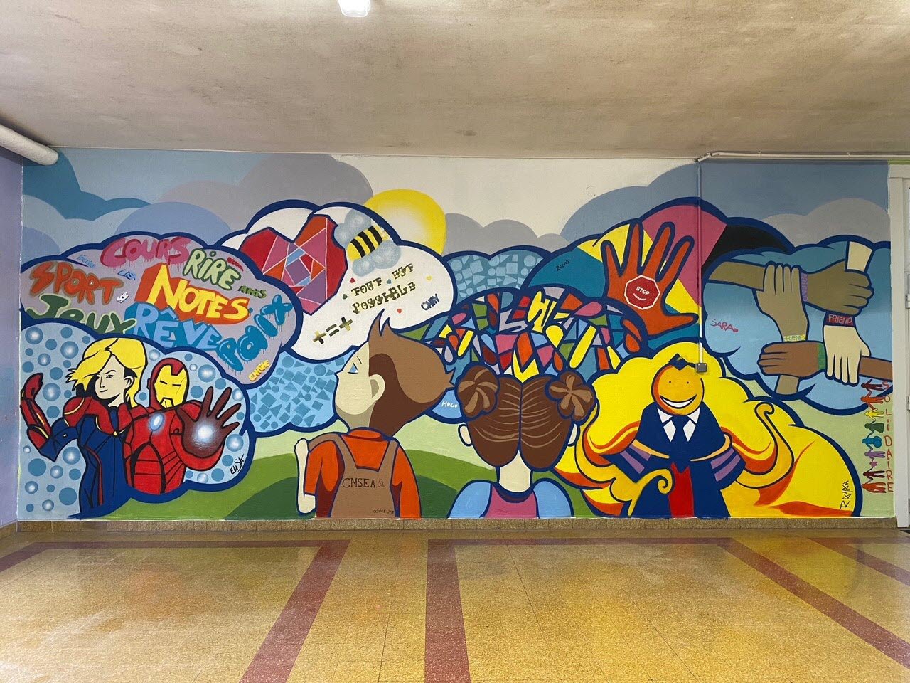 C'était prévu en avril mais le coronavirus en avait décidé autrement. Qu'à cela ne tienne, l'atelier jeune a tout de même eu lieu mais lors des dernières vacances de la Toussaint. Tout au long de ces congés scolaires, sept jeunes, âgés de 14 à 17 ans, du club de prévention CMSEA de Florange ont réalisé une superbe fresque sous le préau de l'école élémentaire Trait-d'Union. Ce travail, dont le but était avant tout de valoriser en le décorant un endroit de la ville, a vu le jour en étroite collaboration avec la municipalité et l'école concernée.