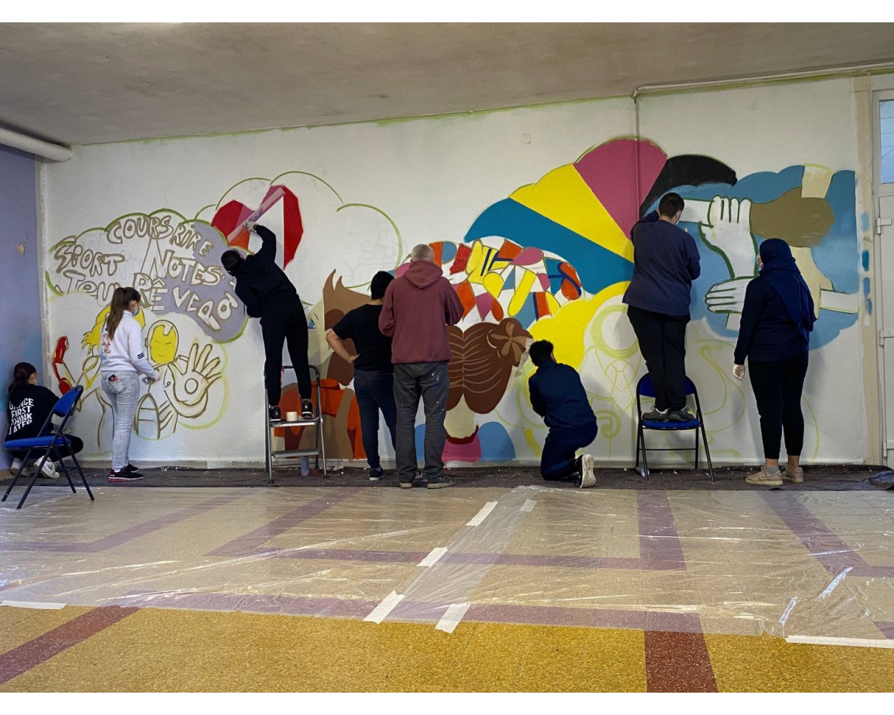 Les jeunes ont ainsi peint et remis à neuf le mur du préau avant d'y dessiner, avec l'aide du graphiste David Soner, des messages concernant la discrimination, la solidarité, le respect et le harcèlement qu'ils désiraient transmettre. « Ce travail leur appartient de A à Z. Ils ont été vraiment acteurs de la fresque. Ils ont tout pensé, de la réalisation des croquis, pour déterminer les messages qu'ils voulaient faire passer, à la réalisation finale », confie Estelle Rimbert, éducatrice du club de prévention.